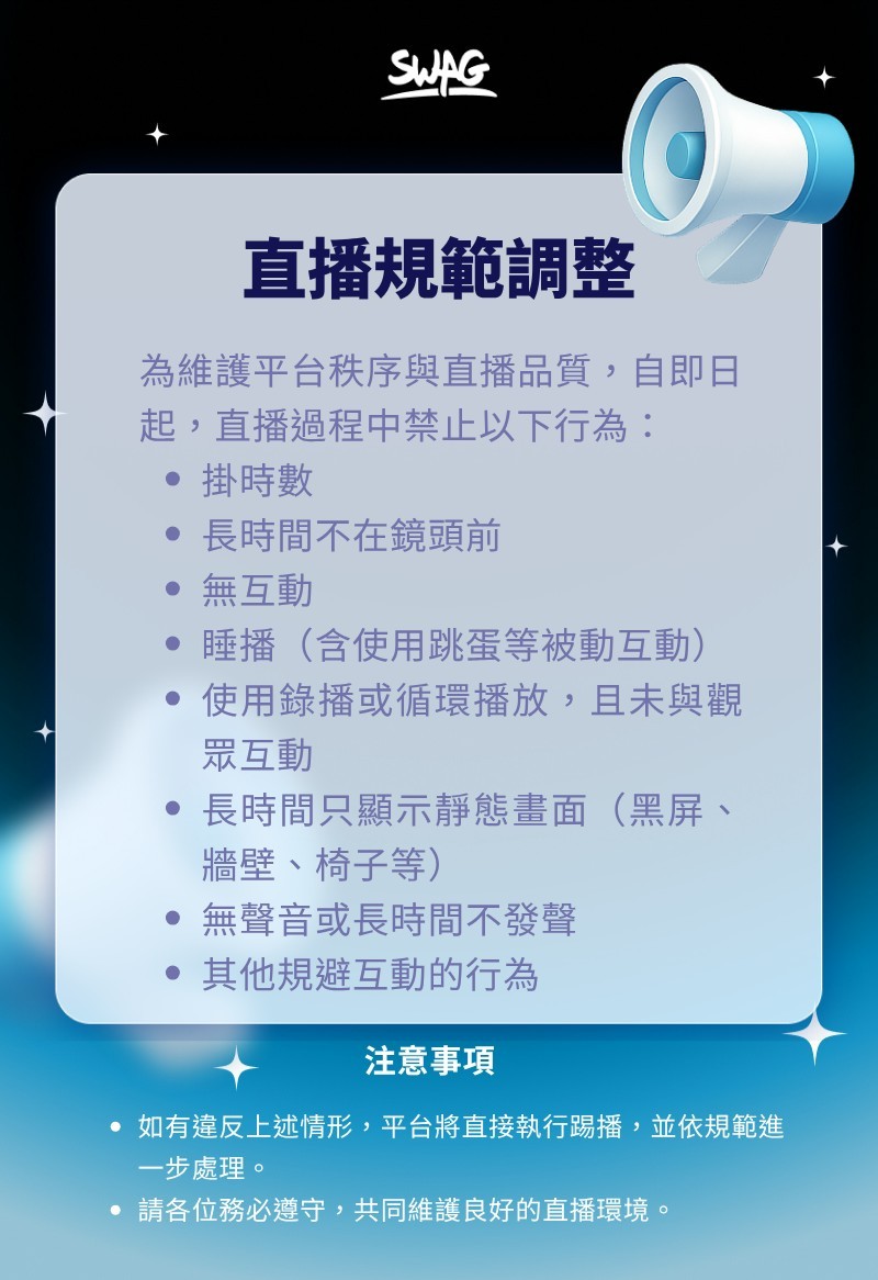 請各位務必遵守,共同維護良好的直播環境。